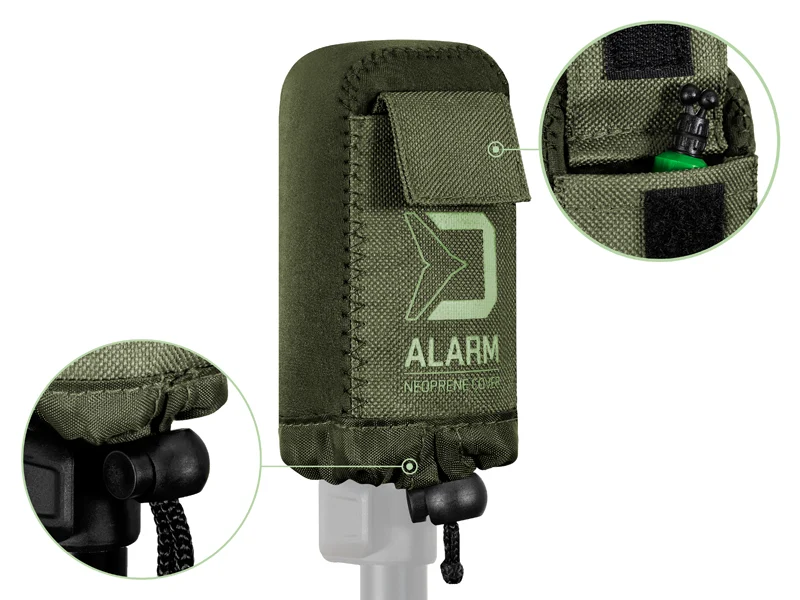A Delphin ALARM egy termék, amely a jelzőberendezések szállítás közbeni védelmére szolgál a mechanikai sérülések és az eső ellen. Neoprénből készült, aminek köszönhetően az egyes falak vastagok és kellően puhák ahhoz, hogy megbízhatóan megvédjék az elektromos jeladókat a ütődéstől vagy egyéb károsodástól. Az elülső részben praktikus zseb található például láncos kapásjelző vagy tartalék elemek tárolására.