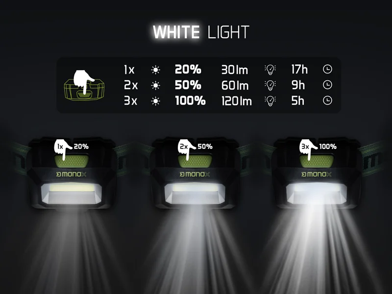 A fehér fény három világítási móddal rendelkezik. Az első gombnyomás 20%-os intenzitáson kapcsolja be a lámpát, akár 17 órás üzemidővel. A második nyomás az 50%-os módot aktiválja, amely 60 lumen fényerőt biztosít, és 9 órán át működik. A harmadik nyomás a legerősebb, 100%-os módra vált, amely 5 órán át világít. A gomb hosszabb nyomva tartásával a zöld fényt kapcsolhatjuk be, amely kétféle módban használható. Az első módban 100%-os intenzitással világít 12 órán át, míg a második módban – egy újabb gombnyomással – az intenzitás 50%-ra csökken, így az üzemidő akár 40 órára is meghosszabbítható. A zöld fény egyik nagy előnye, hogy nem vonzza a kellemetlen rovarokat, ami különösen hasznos a forró nyári estéken.