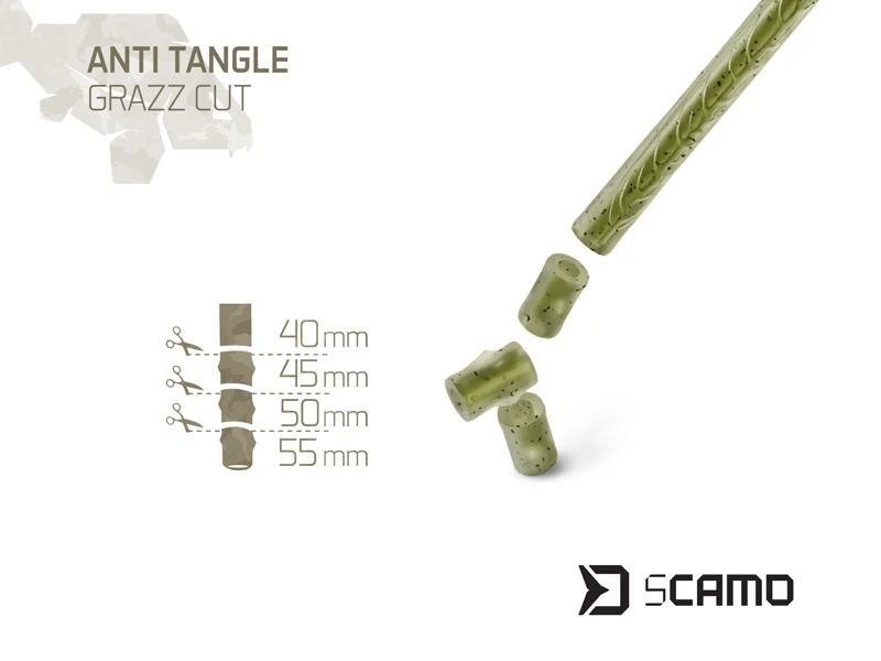 A Delphin sCAMO GRAZZ Cut anti-tangle hüvely szinte teljesen láthatatlan a víz alatt. Gyorskapcsos forgó rögzítésére szolgál, illetve hatékonyan megakadályozza a szerelék összegabalyodását dobás közben. Felületi struktúrája és zöld színe vízinövény-szárat imitál, így tökéletesen beleolvad a környezetbe, rendkívül diszkrét és feltűnésmentes megjelenést biztosít. A hüvely teljes hossza 55 mm, azonban a felső részén 5 milliméterenként elhelyezett bevágások találhatók, amelyek lehetővé teszik, hogy az anti-tangle hüvelyt könnyedén a kívánt hosszra rövidítsük.