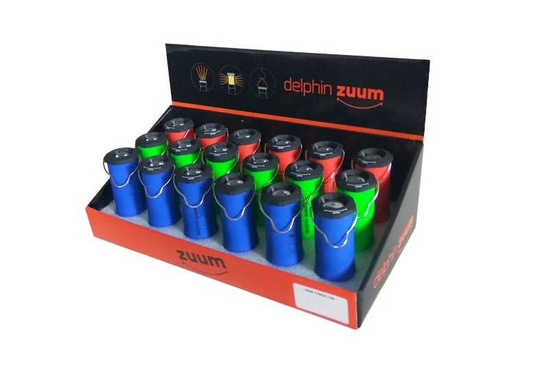 A Delphin ZUUM lámpa 18 darabos bemutató tartóban kapható (6x zöld, 6x narancs és 6x kék szín).