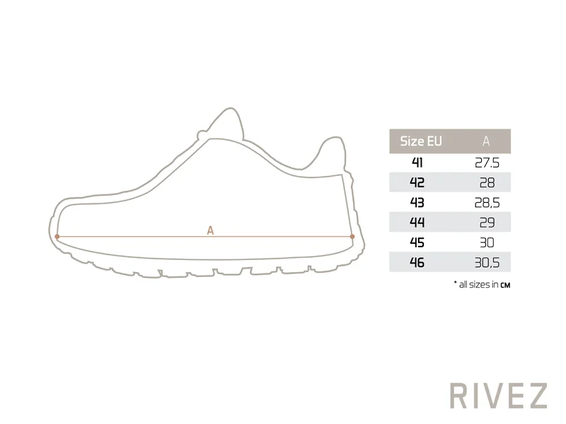 A RIVEZ modell kényelmes és biztonságos egész napos viseletre készült még olyan nehéz körülmények esetén is, ahol minden lépésnél fontos a megbízhatóság. Legfontosabb előnye a vízállósága, amelyet a cipő belsejében található speciális membránzokni biztosít. Ennek köszönhetően nem kell tartania a nedves fűtől, a hirtelen kialakuló záporoktól vagy a sártól – a lába minden körülmények között száraz marad.