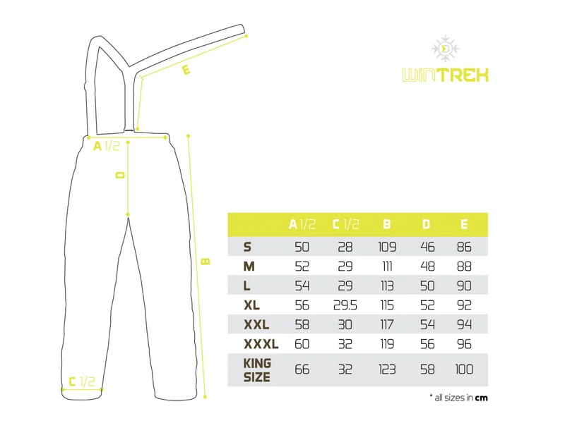 A WinTREK nadrág mindkét oldalán cipzáras zsebekkel rendelkezik, a cipzárak feltűnő sárga szövettel vannak varrva, és vízálló szegéllyel vannak bevonva. A dereka állítható, elasztikus nadrágtartókkal rendelkezik, amelyek a magasságához állíthatók, és tépőzárral teljesen egészben levehetők. A derékrész egy integrált elasztikus szalaggal rendelkezik, amely növeli a nadrág rugalmasságát és nyúlását. A belső oldala sima steppelt anyagból készült, így a nadrág könnyen hordozható és kényelmes viselet.