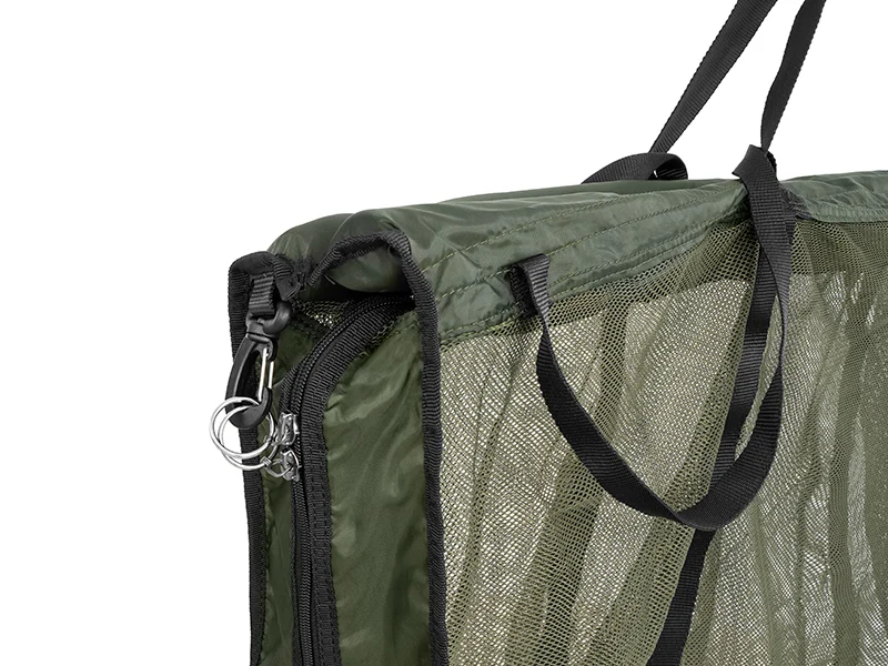 A háló két fekete textil hevederrel van megerősítve, amelyek a középső fogantyúba futnak. A hosszú fogantyúknak köszönhetően a zsák könnyen felakasztható a mérlegre. A zsák emellett mindkét oldalán textil fogantyúkkal van ellátva, amelyek egyszerű emelést és szállítást biztosítanak. Az erős cipzárak mindkét oldalon és a felső részen találhatók, ami azt jelenti, hogy a CWS szinte teljesen kicipzározható a hal könnyebb kezelése érdekében.