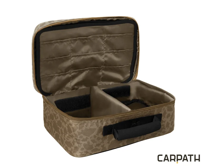 A Delphin Area TACKLE Carpath egy praktikus bélelt apró cikkes táska, mely elsősorban a horgászoknak készült. A fő pakoló rész egy tépőzárral állítható bélelt fallal tudja szüksége szerint kialakítani, ahova elhelyezheti előketartó dobozait, ólomkészleteit vagy a kapásjelzőit. Középen van egy válaszfal, ahova zacskóstól el tudja helyezni a horgokat, forgókat , stoppereket és egyéb végszerelék kellékeit. Biztosan talál itt helyet kisebb tekercs előke zsinóroknak is. A válaszfal mindkét oldalán 9 zseb található.