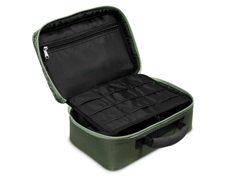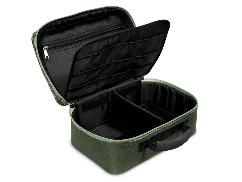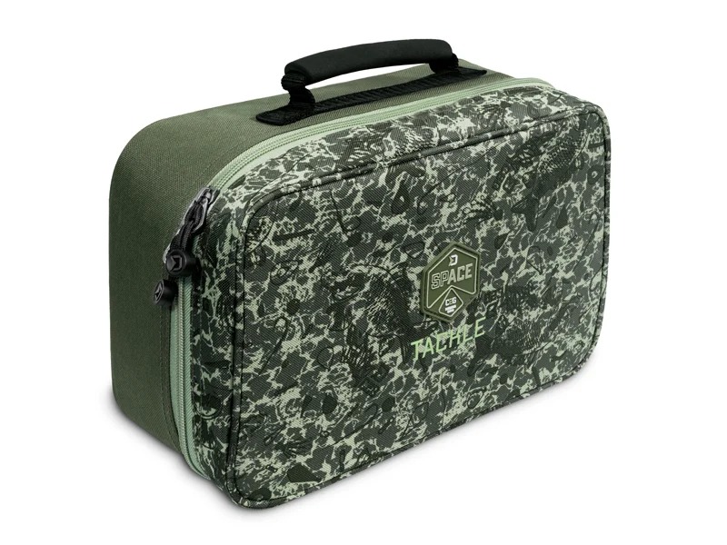 A Delphin TACKLE SPACE egy praktikus, párnázott táska C2G terepszínben, amelyet elsősorban kiegészítők tárolására terveztek. A fő tárolórészt egy párnázott tépőzáras elválasztó osztja fel, amely az Ön igényei szerint variálható. Szerelékes dobozok, súlyok, előkezsinórok és sok más előkekészítéshez szükséges kiegészítő tárolható benne. A középen található panel mindkét oldalon kis hálós zsebek találhatók, amelyek a horgok, forgók vagy egyéb tárgyak tárolására szolgálnak. A hálós anyagnak köszönhetően mindig gyorsan megtalálhatja a keresett tárgyakat.